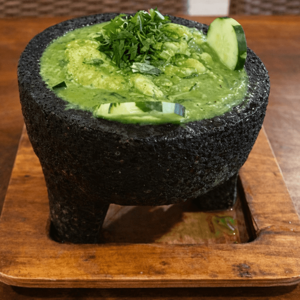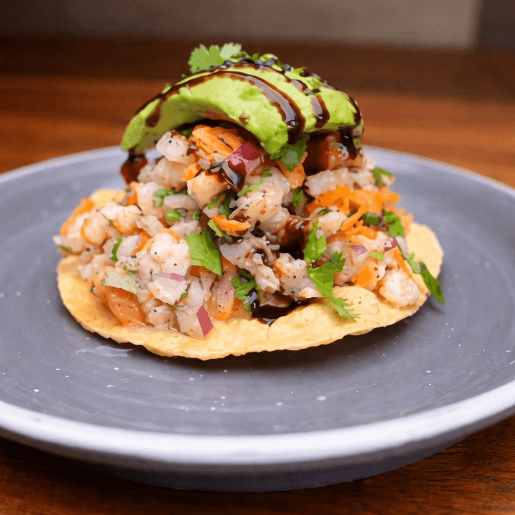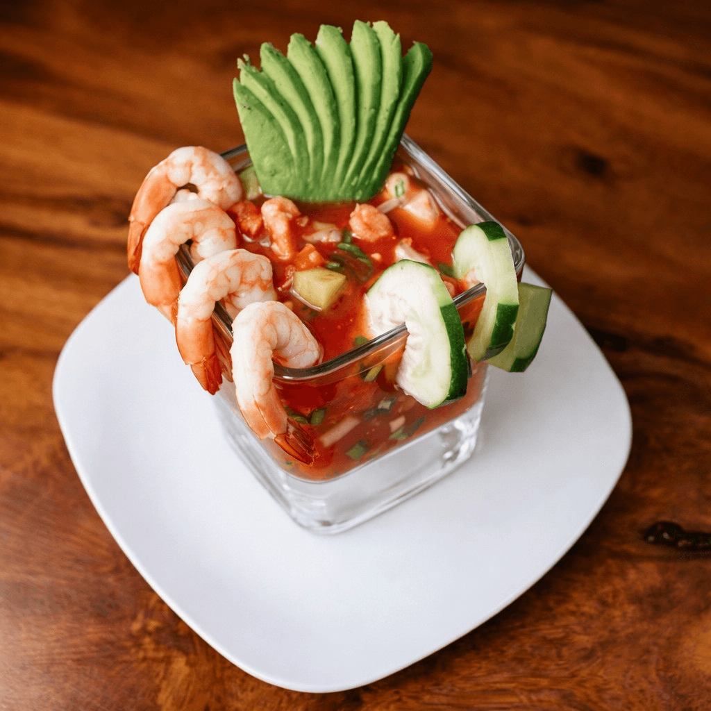 Shrimp marinated in lime, with cilantro, onion, cucumber and avocado, your choice of green, red or dark sauce, topped with homemade campana sauce
