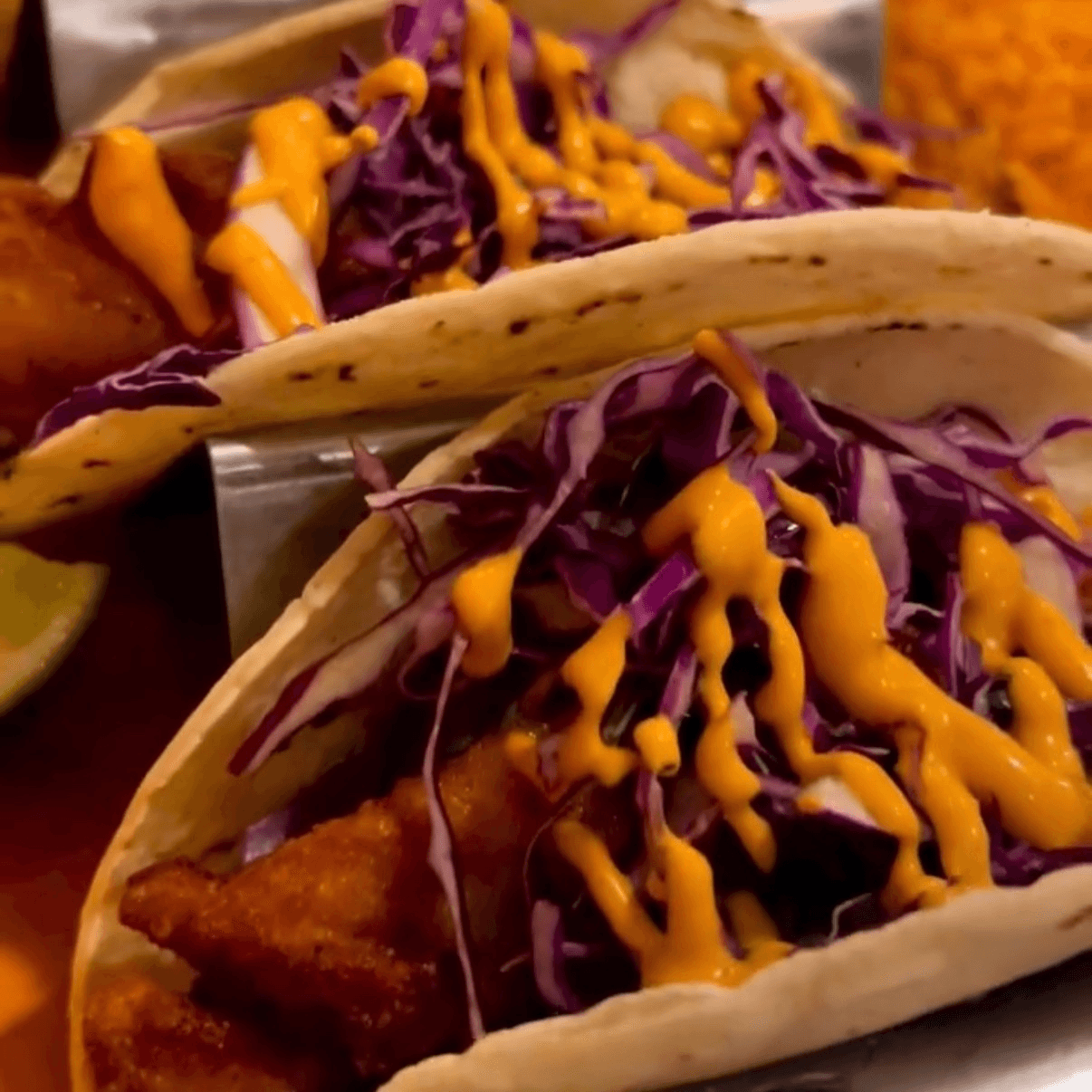 3 flour or corn tortillas, topped with cabbage, pico de gallo & chipotle mayo. Served with rice