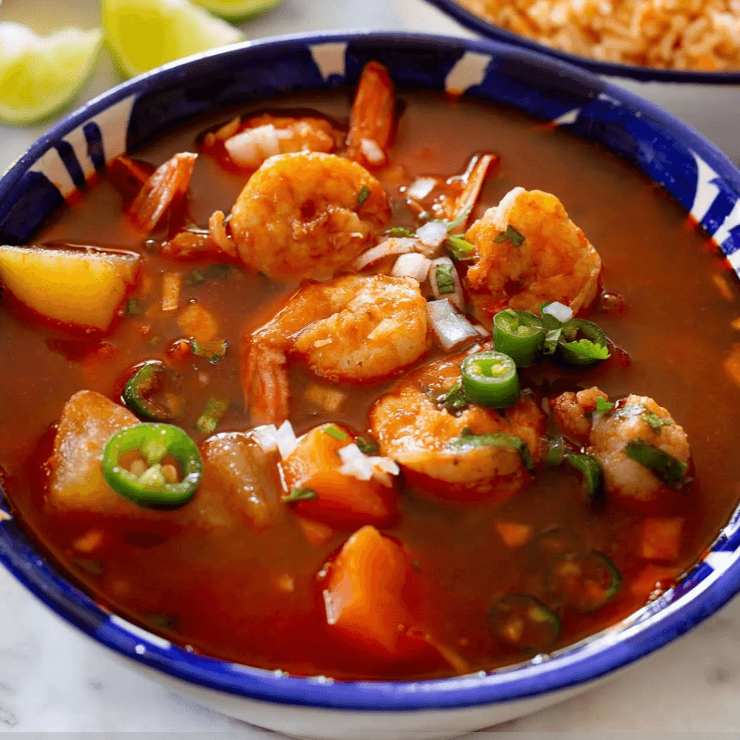 Shrimp or fish soup with veggies. Served with jalapeño, cilantro & onion on the side