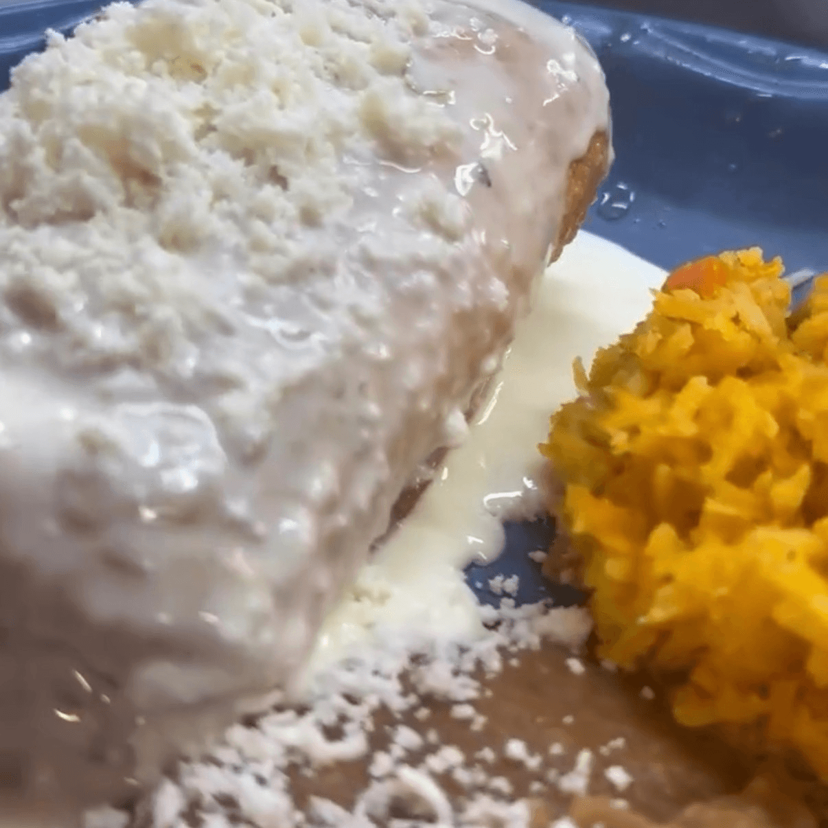 Crispy flour tortilla wrap filled with ground beef. Served with rice and beans. Topped with cheese dip & queso fresco