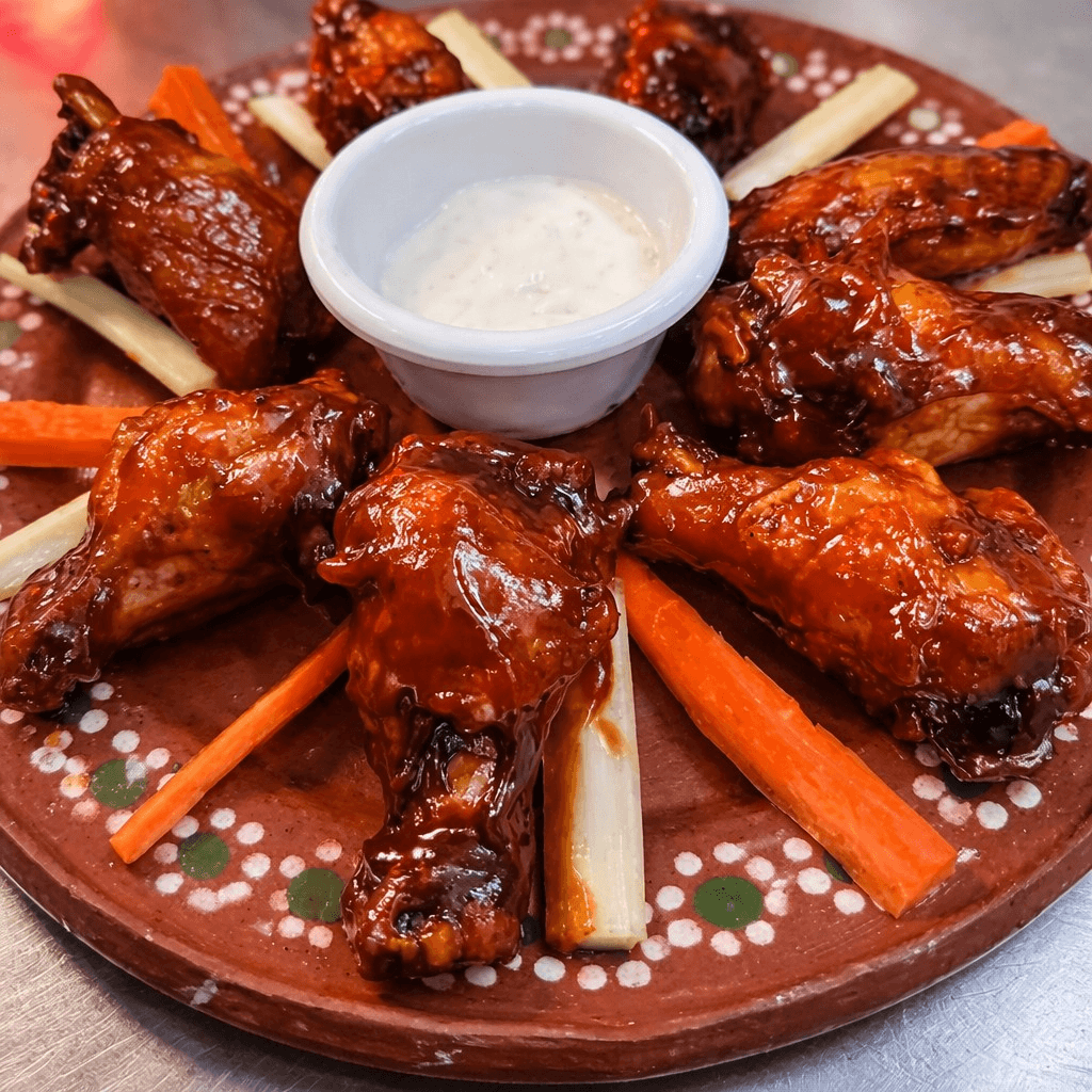 8 pieces of wings sautéed in your choice of mango habanero, buffalo, BBQ or plain. Served with carrots and celery