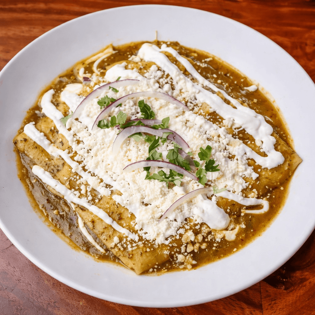 3 corn tortillas filled with cheese, tinga or ground beef, topped with cream sauce & queso fresco. Served with rice and beans. Choice of red, green, mole or chipotle sauce