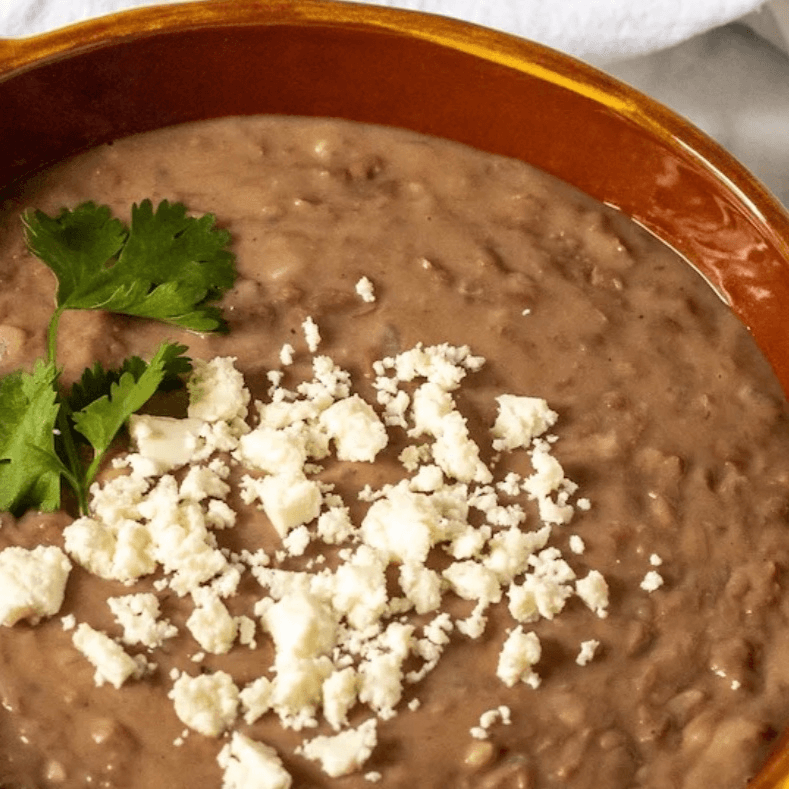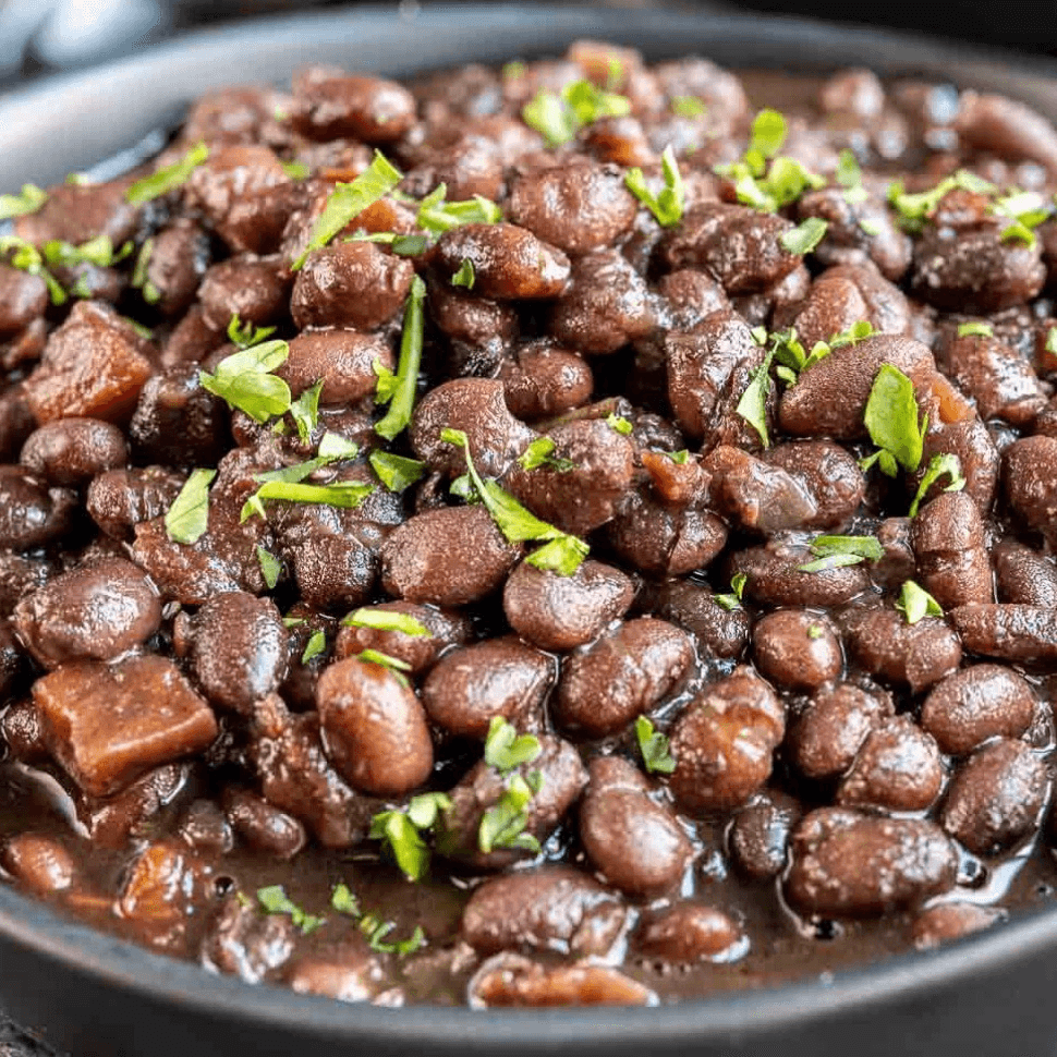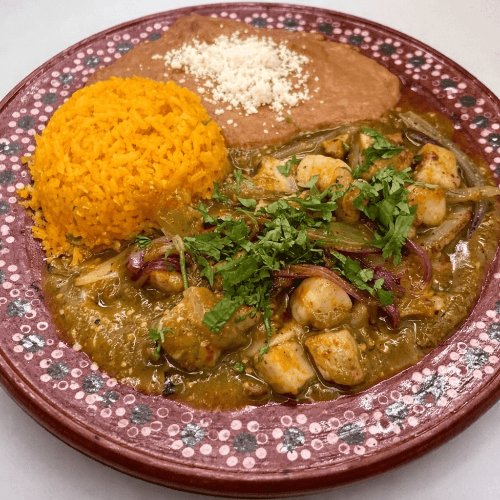 Juicy pork cooked in a copper pot. Topped with cilantro and onions. Served with rice & beans