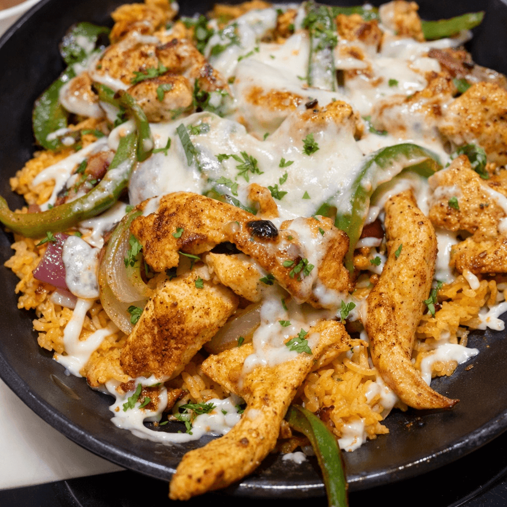 Sliced grilled chicken breast over a bed of rice topped with cheese dip and cilantro