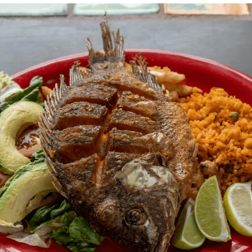 Fried whole Tilapia. Served with Rice, Beans, Lettuce, Tomato and Avocado Slices.
