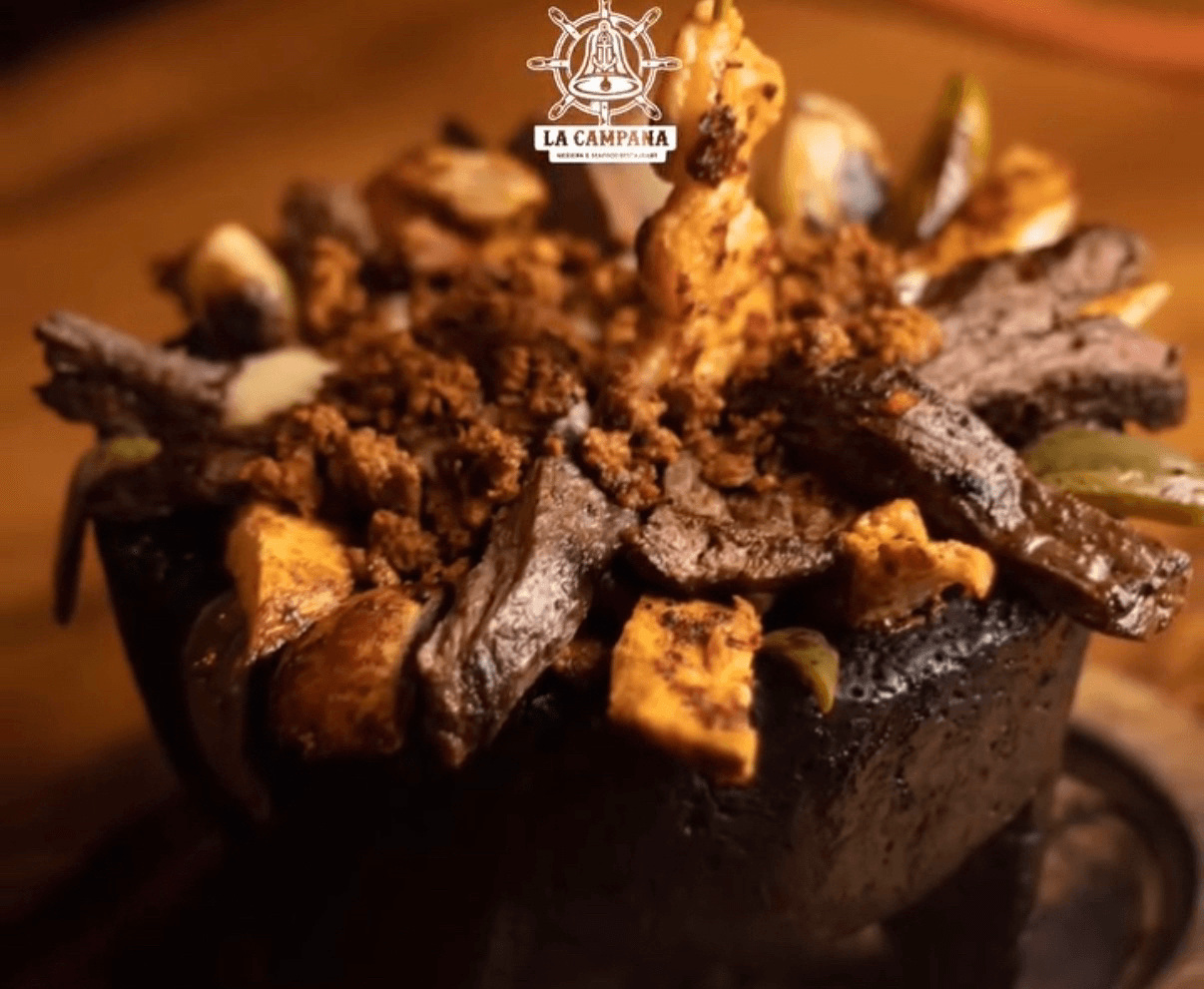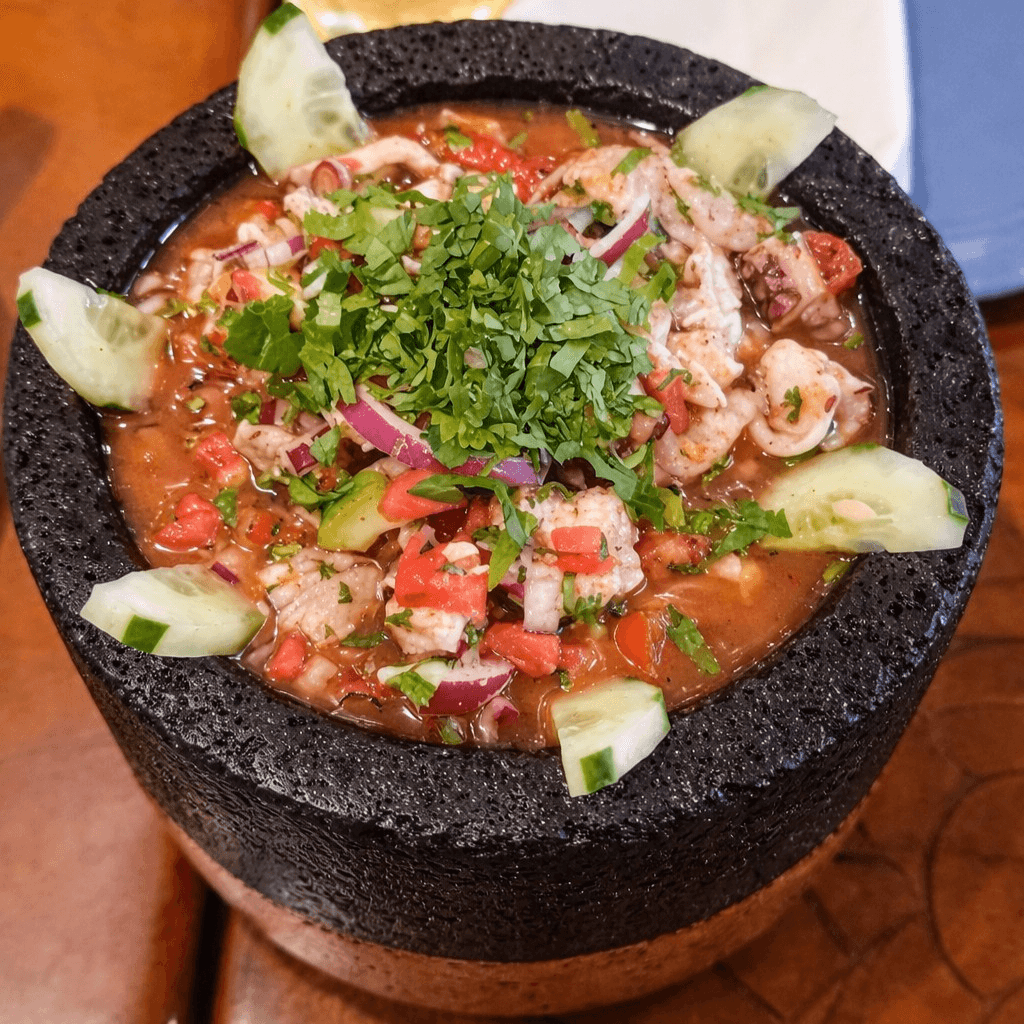Your choice of seafood marinated in lime mixed with onion, cucumber, cilantro, tomato and serrano pepper, topped with la campana spicy dark sauce