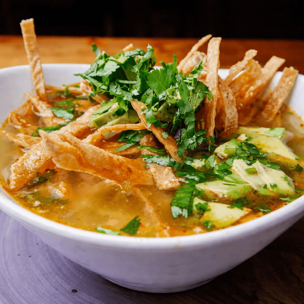 Tortilla soup in a tomato broth with shredded or grilled chicken, topped with cheese, cilantro and tortilla chips. Served with jalapeño, cilantro & onion on the side