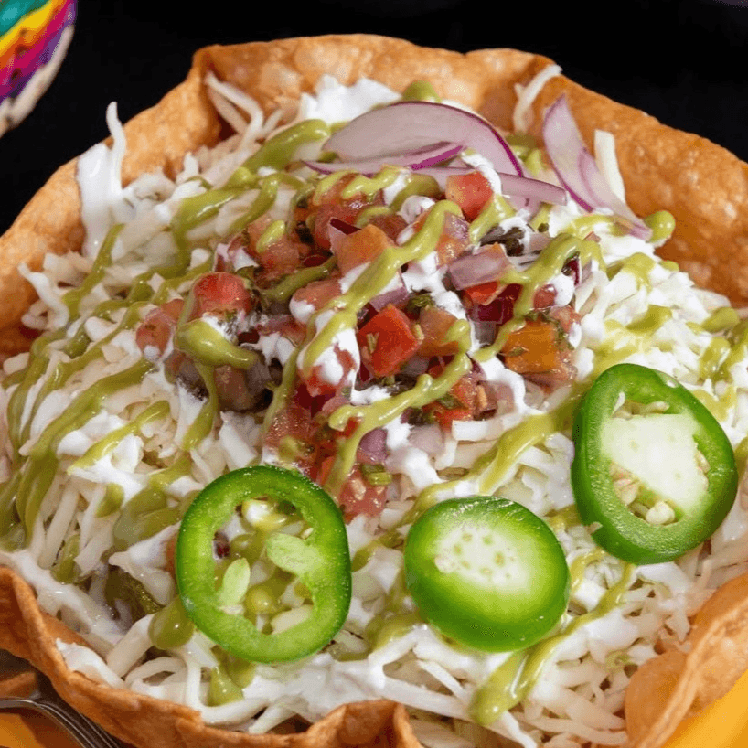 Topped with lettuce, pico de gallo, cheese, sour cream and avocado sauce. Served in a taco shell