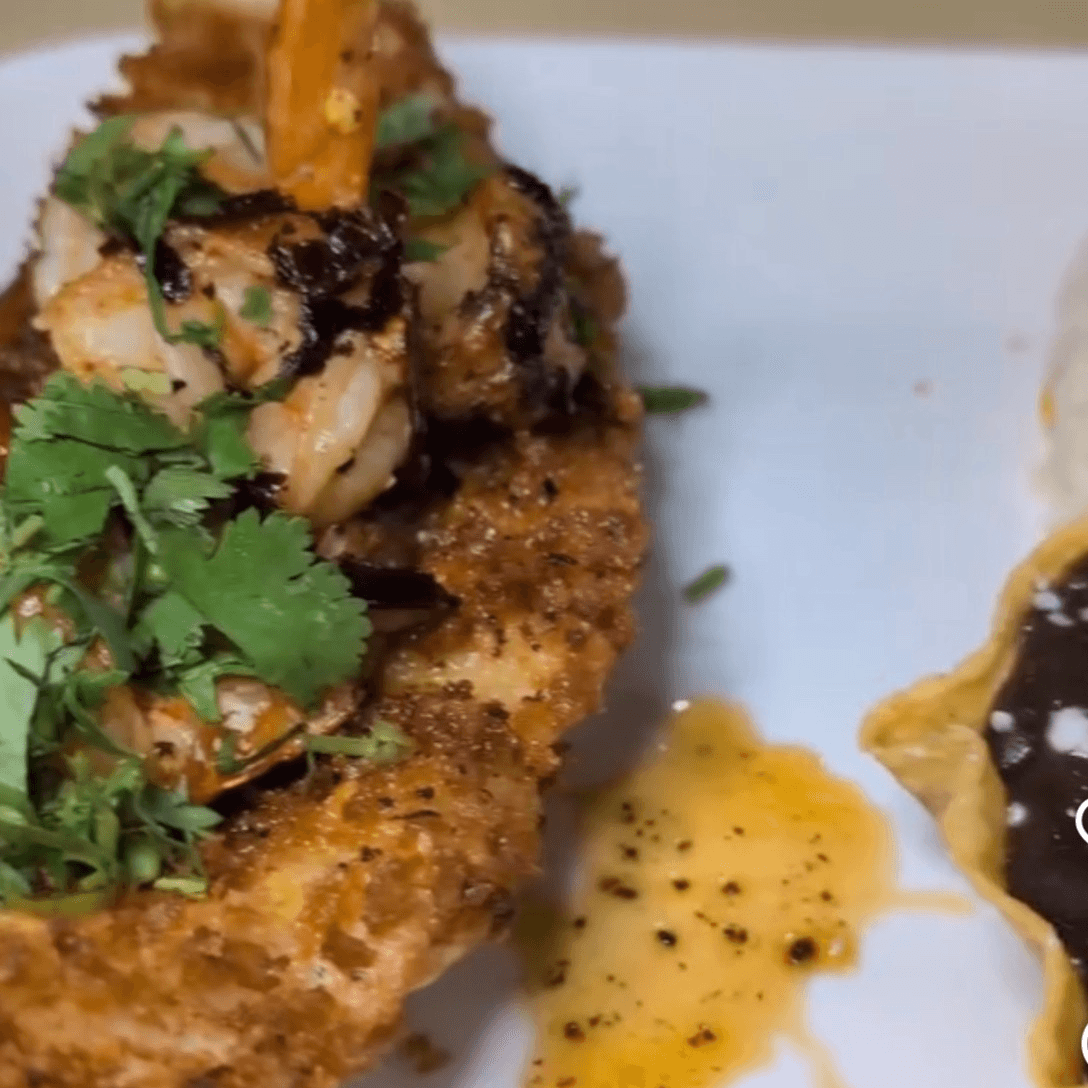 Fish fillet breaded or grilled. Topped with 4 garlic or diabla shrimp. Served with white rice, black beans. Garnished with cabbage and pico de gallo and avocado slices