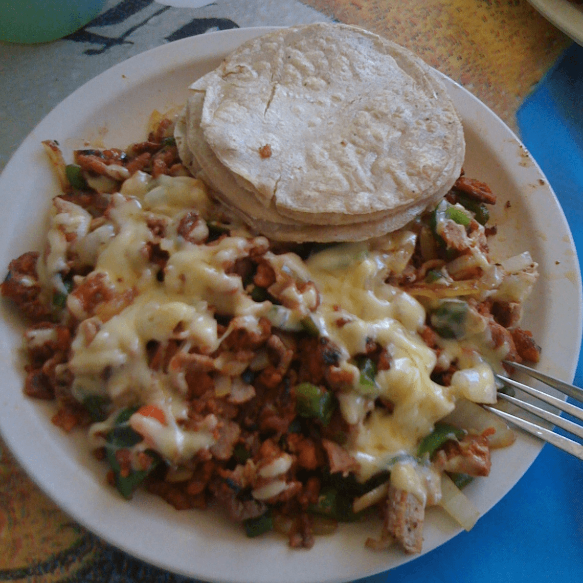 3 pieces. Mexican melted cheese in a corn tortilla with stewed meat & consomé on the side, topped with cilantro & onion served with black beans