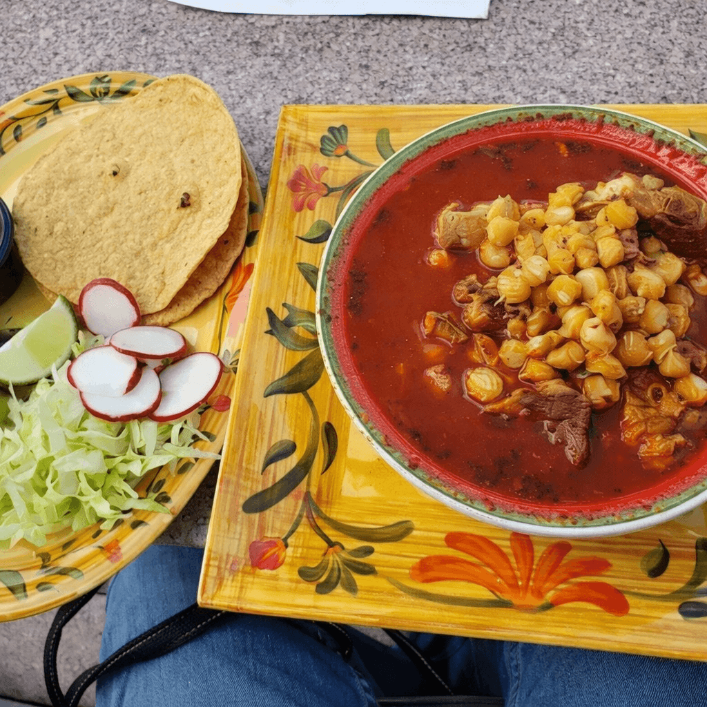 Mexico's favorite soup with pork and corn in a chile based broth, served with a side of lettuce, and chile peppers. Served with jalapeño, cilantro & onion on the side