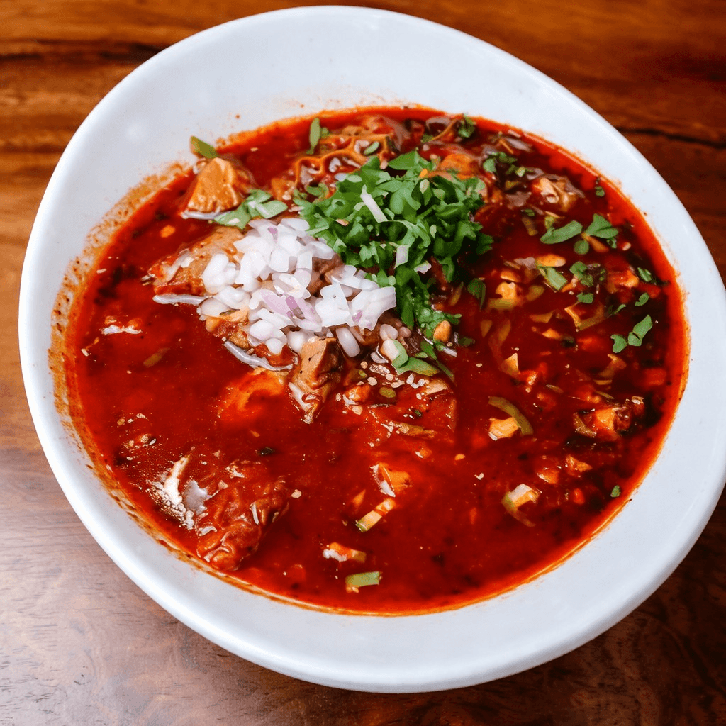 Traditional beef tripe soup in a chile pepper broth. Served with jalapeño, cilantro & onion on the side