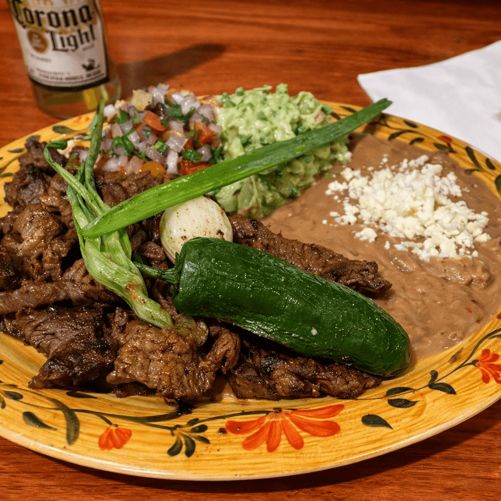 Grilled steak served with rice and beans. Garnished with grilled jalapeño, lettuce & pico de gallo, served on a bed of peppers & onions