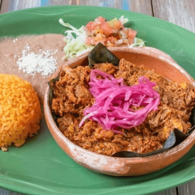 Marinated pork with achiote and cooked until tender. Topped with onions and served with rice and beans