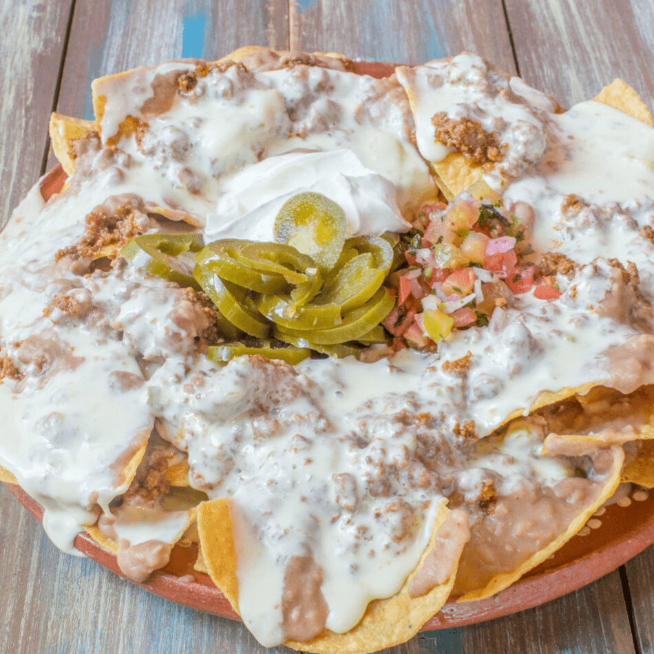 Tortilla chips, topped with beans, cheese dip, lettuce, jalapeños, pico de gallo & sour cream