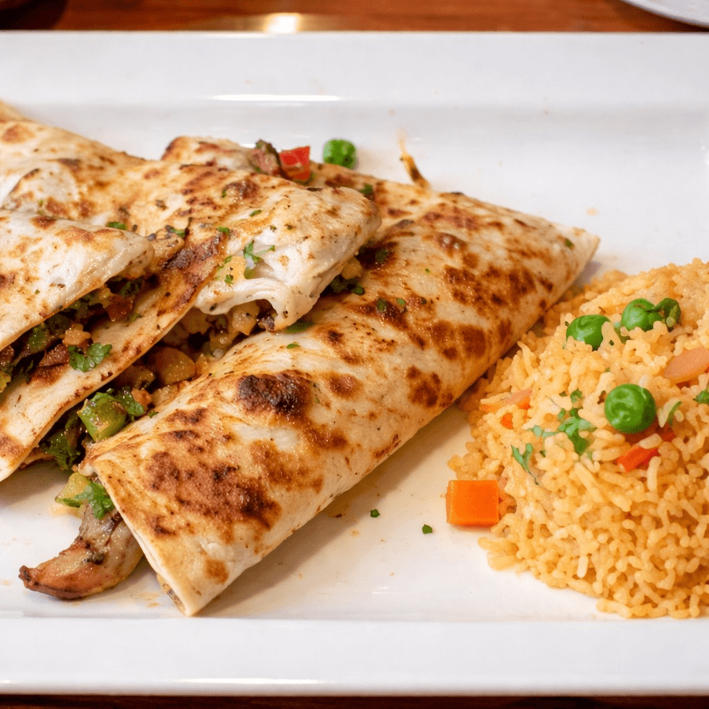 Grilled flour tortilla, filled with cheese, and your choice of protein, served with rice and beans