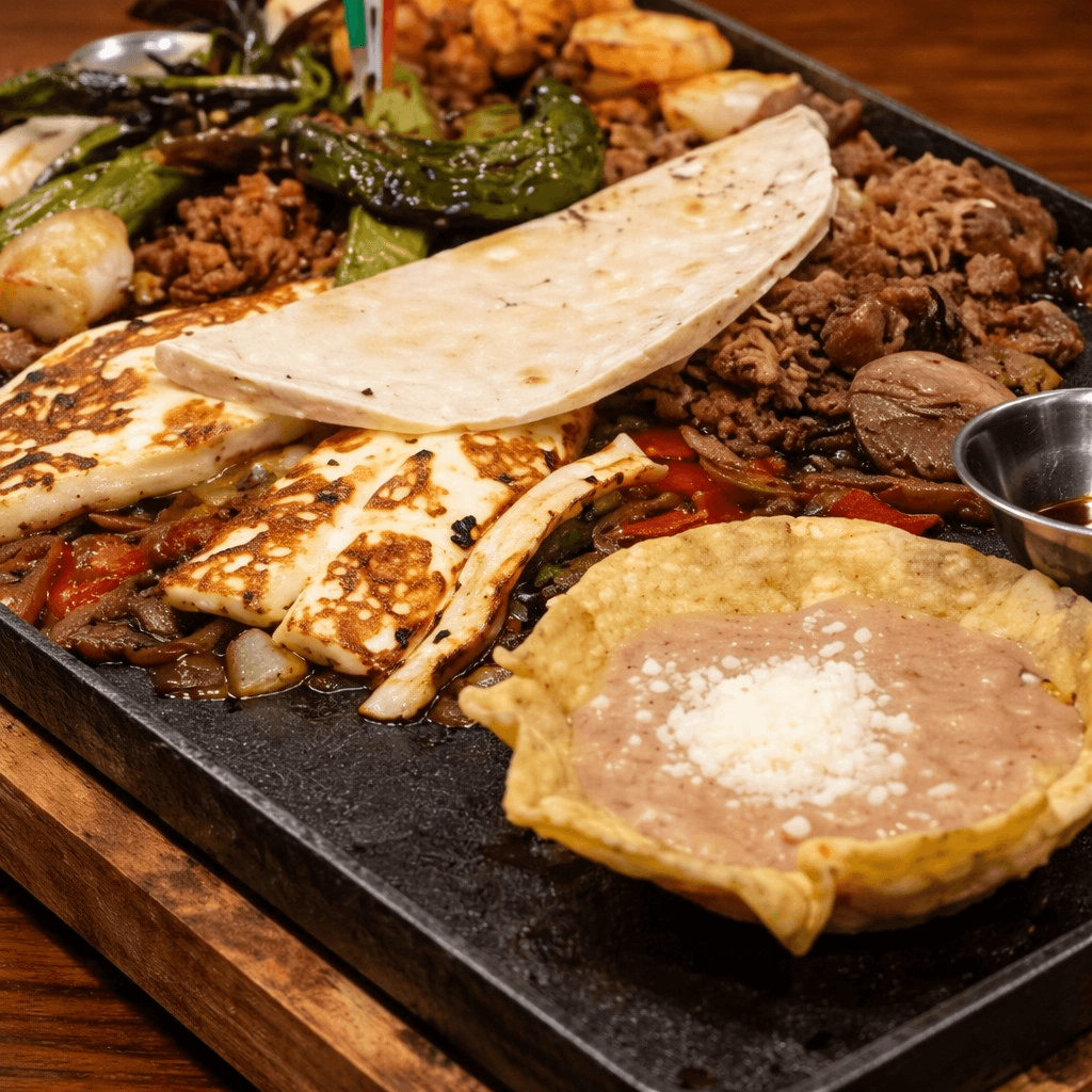 Chicken, steak, shrimp, crab leg, chorizo, carnitas, avocado, corn, grilled cheese, cactus, potatoes, and 2 quesadillas. Served with rice, beans, guacamole, sour cream, lettuce, and pico de gallo